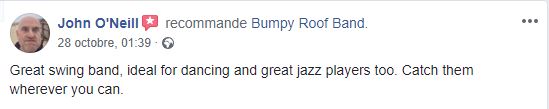 ROOF BANDSwinging jazz band from Rennes, Tours & Paris which will make you dance all night long!!! :-) TESTIMONIALS "Everysense I heard Bumpy Roof play in Barcelona I was thinking about bringing them to the Chase Festival in Heidelberg! Finally I took the opportunity in 2018 and both my customers and I loved it! They were so easy going and competent during set-up and always there to start the sets so that I did not need to worry about anything! I can highly recommend them for you event, specially if you want people to dance a lot!" - Ali Taghavi, Chase Festival https://www.chasefestival.com/ "Bumpy Roof Band came to entertain us for a whole weekend of lindy hop dance exchange, playing every night and we could not have enough of their music! All the dancers had a fantastic time dancing to music played by incredibly talented musicians. We didn't want to miss any of the songs! They brought a superb atmosphere and really made the event a huge success. There were so many dancers who commented that this was the best event in the history of this exchange and this was largely down to this amazing band who are so much fun to have around. We miss them sorely and hope they will come back to play for us in the near future! Muchas gracias Bumpy Roof, you are the BEST!" Cambridge Lindy Exchange 2018 http://cambridgelindyexchange.co.uk/ Julien Silvand trumpet, voice Matthieu Vernhes clarinet Pierre Guicquéro trombone Nico Morelli piano Pablo Burchard double bass Germain Cornet drums Special guests Monique B. Thomas voice Pablo Lopez guitar